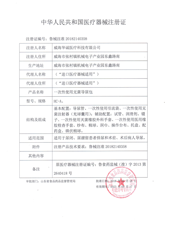 【產品標準號】YZB/魯xxxx-xxxx《一次性使用導尿包》