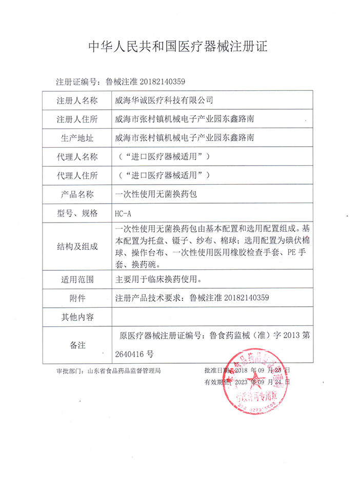 【產品標準號】YZB/魯xxxx-xxxx《一次性使用換藥包》